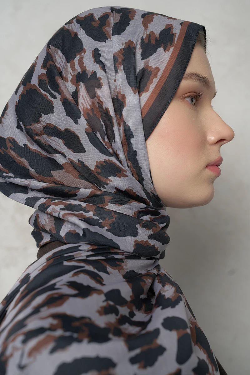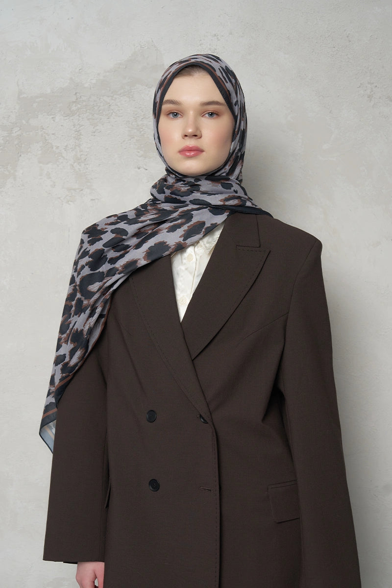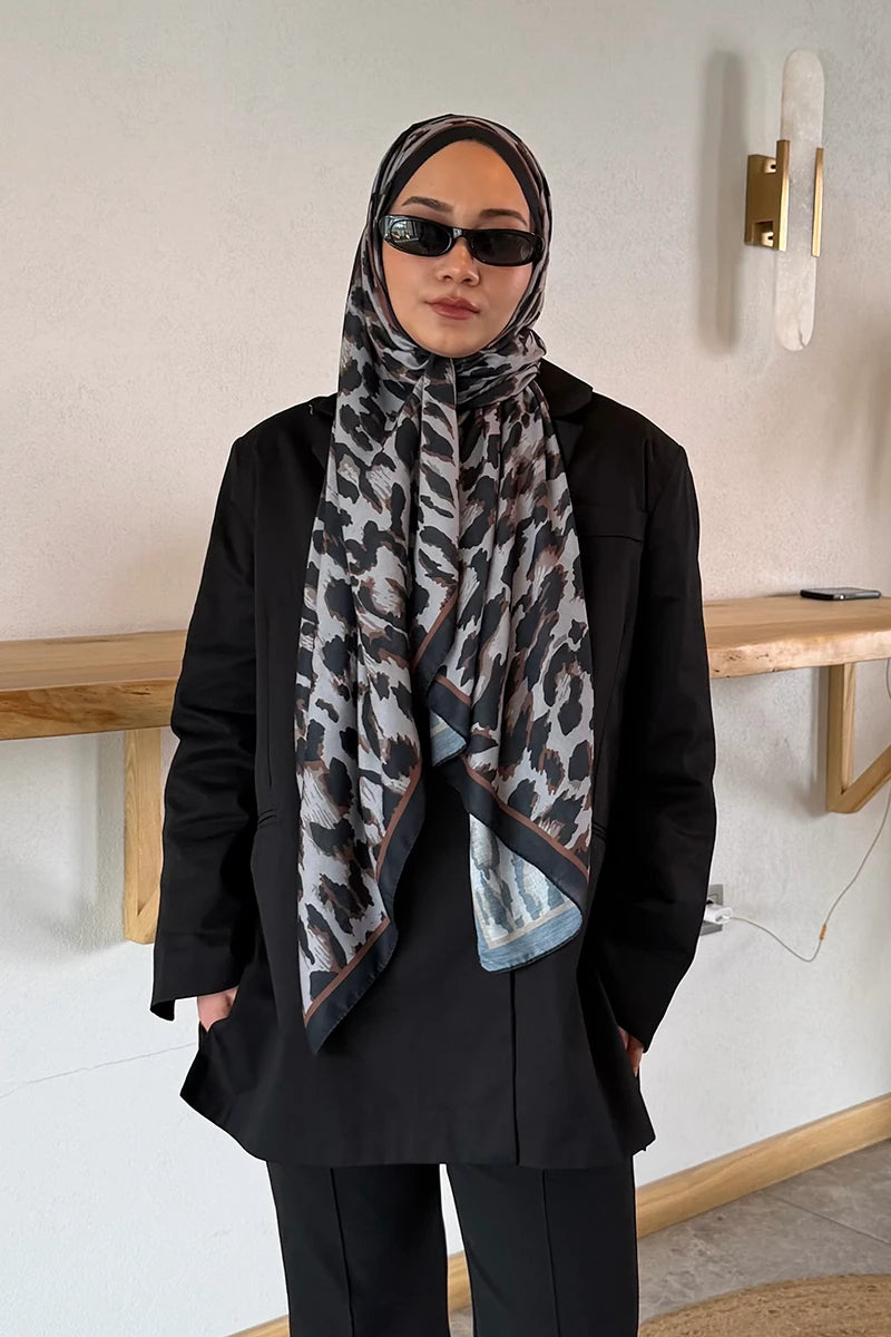 Leopar Desenli Pamuk Dokulu Şal - Gri