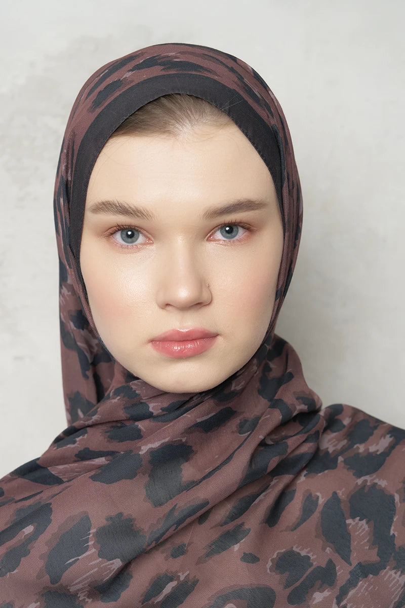 Leopar Desenli Pamuk Dokulu Şal - Kahverengi