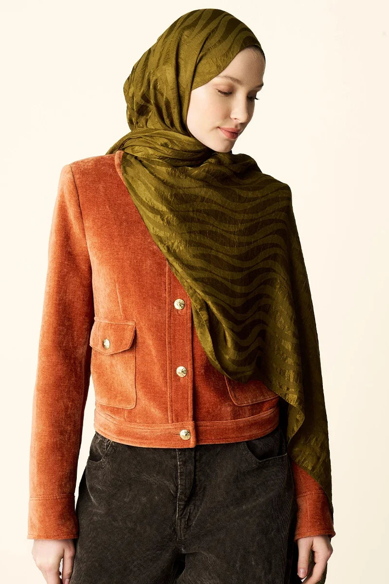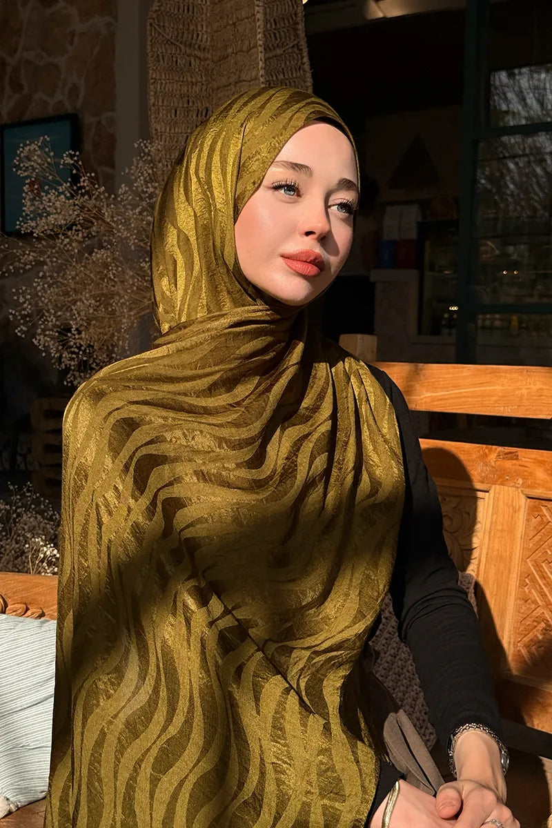 Premium Jakar Şal Dalga Desen - Yağ Yeşili