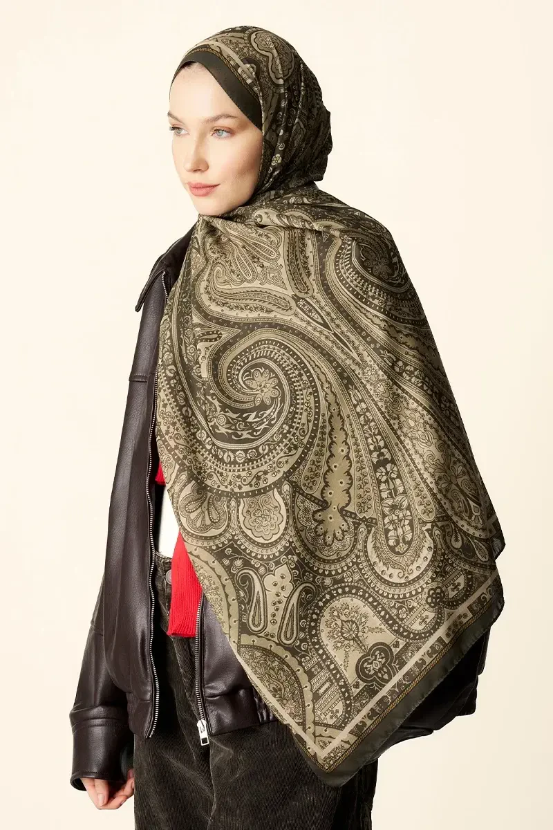Clara Desenli Pamuk Dokulu Şal - Yağ Yeşili